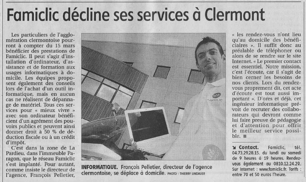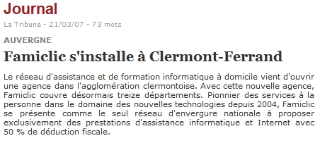 Mercredi 14 mars 2007 - Famiclic décline ses services à Clermont Les particuliers de l'agglomération clermontoise pourront à compter du 15 mars bénéficier des services Famiclic... Cliquez ici pour découvrir l'article. |