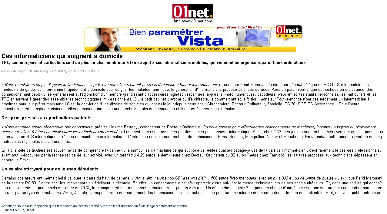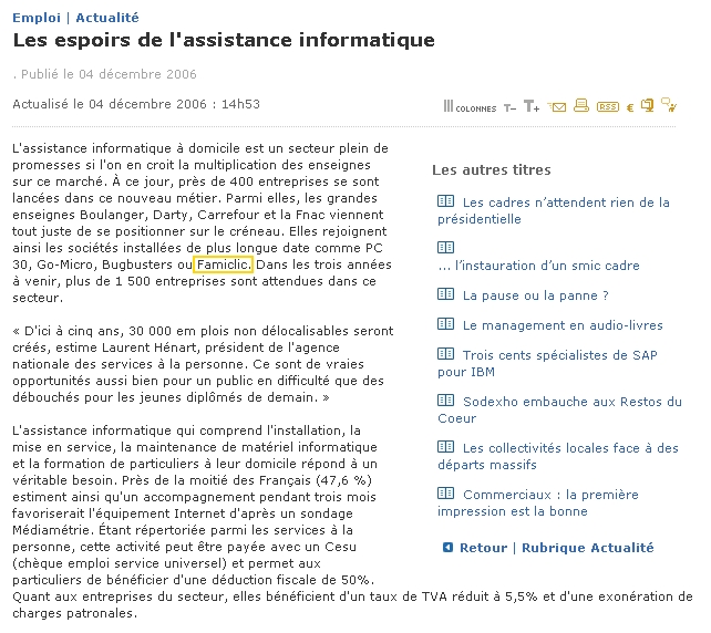 13 novembre 2006 - Le marché prometteur des services à la personne Famiclic illustre le développement de l'activité d'assistance informatique et internet à domicile dans un article intitulé "Le dépannage informatique à domicile prend son essor". |