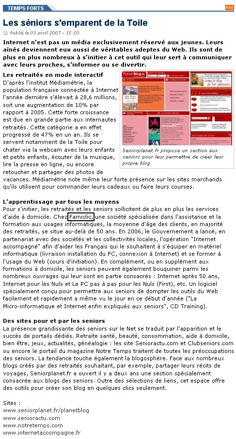 Septembre 2006 - Tous connectés, la formation à internet Le site de la boomer attitude et des seniors choisit Famiclic pour illustrer un article concernant la formation à internet. "Xavier Sillon, le fondateur de Famiclic, voit d'ailleurs dans ce type de service à la personne une aubaine pour tisser du lien social." |